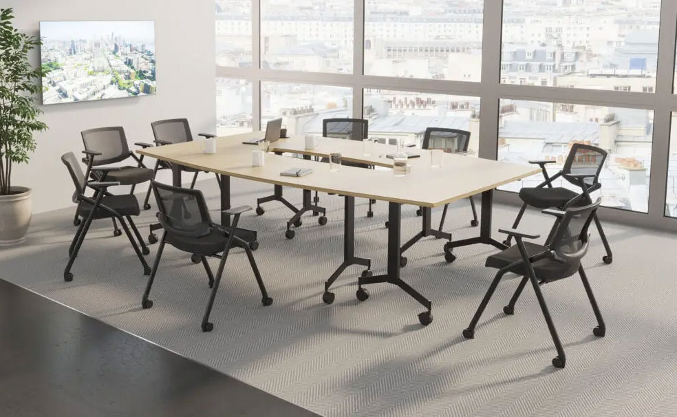 Le rangement des tables par imbrication des piétements permet de réduire l’encombrement des tables stockées : + 19,5 cm par table supplémentaire en profondeur en plus de l’encombrement de la 1ère table pliée (P 60 / P 70 cm).