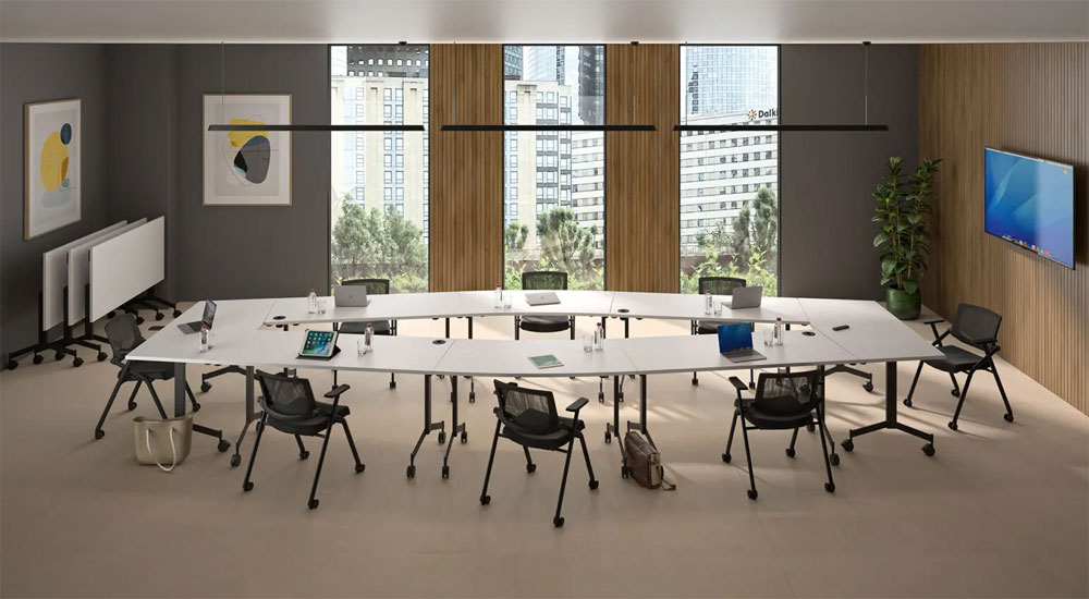 Le rangement des tables par imbrication des piétements permet de réduire l’encombrement des tables stockées : + 19,5 cm par table supplémentaire en profondeur en plus de l’encombrement de la 1ère table pliée (P 60 / P 70 cm).