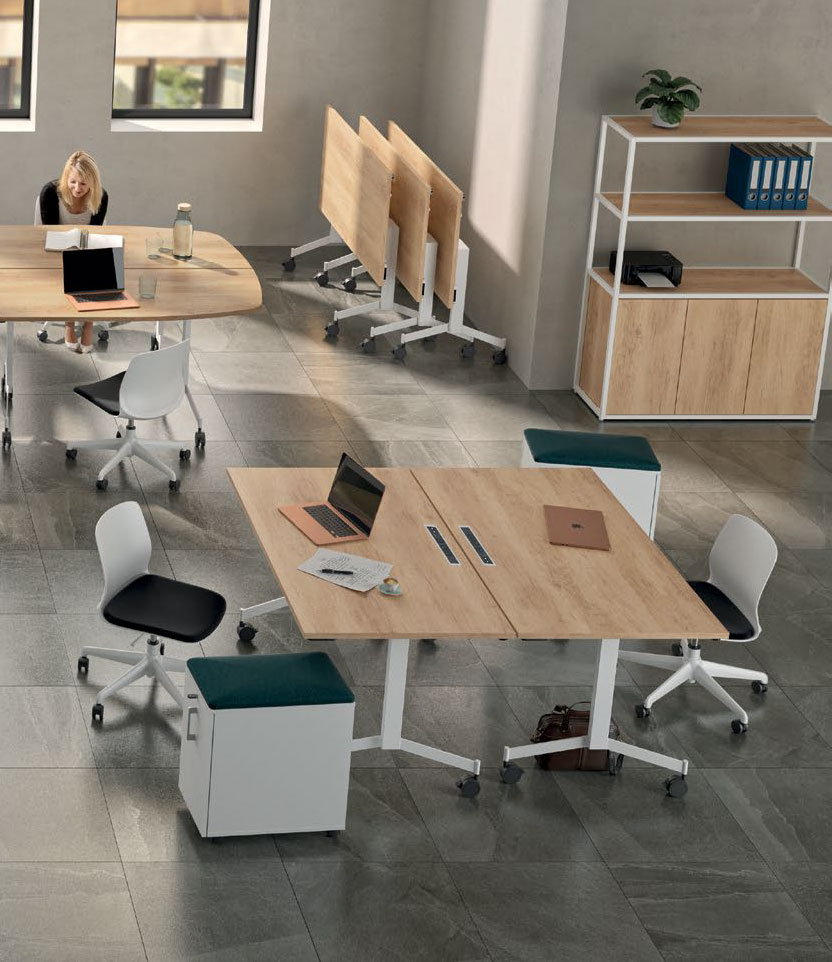 Plateaux en panneaux mélaminés Structurex® 25 mm, chants ABS anti-choc 2 mm.